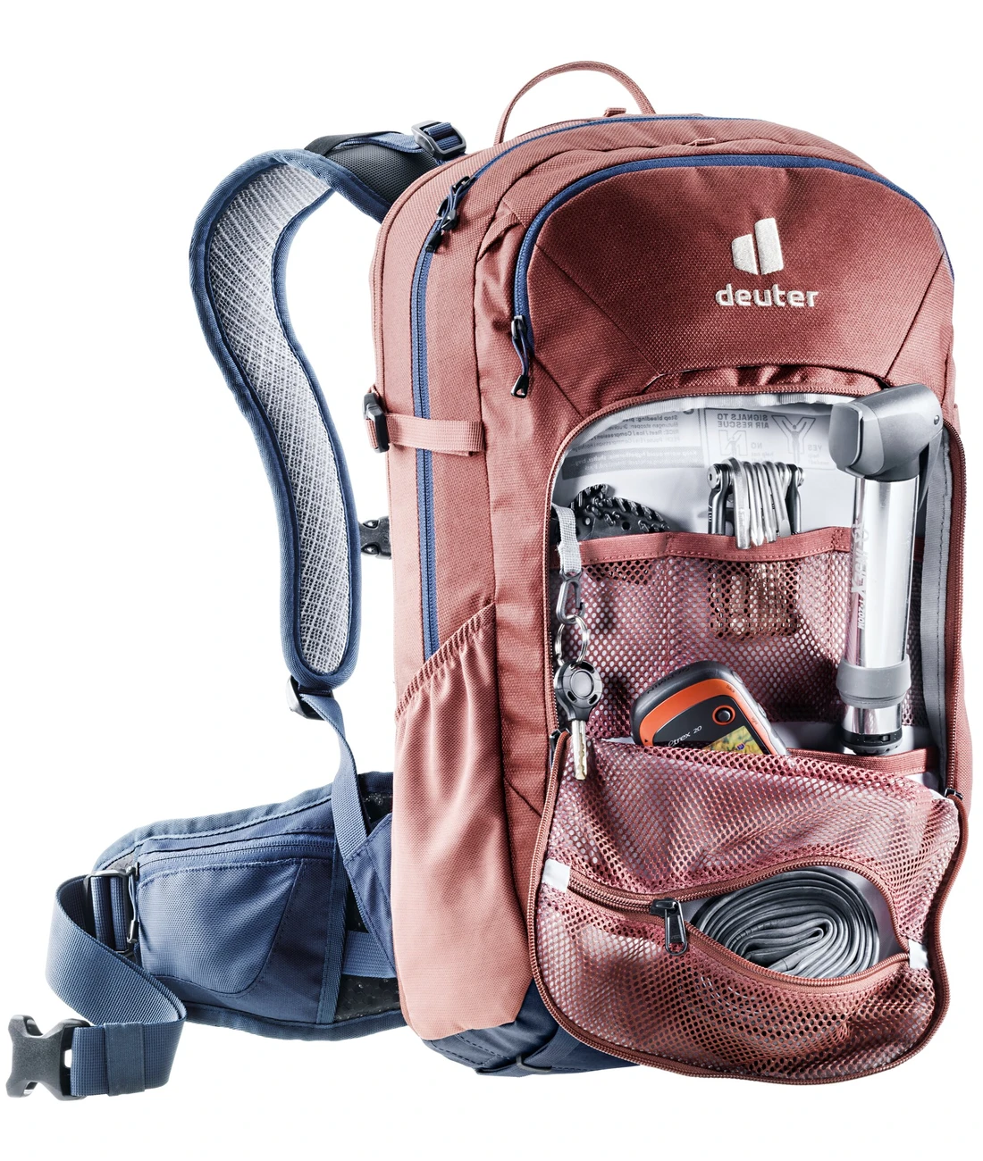- Vortasche mit großem Organisationsteil und RV Netztasche für Schlauch, Werkzeug und Pumpenhalterung