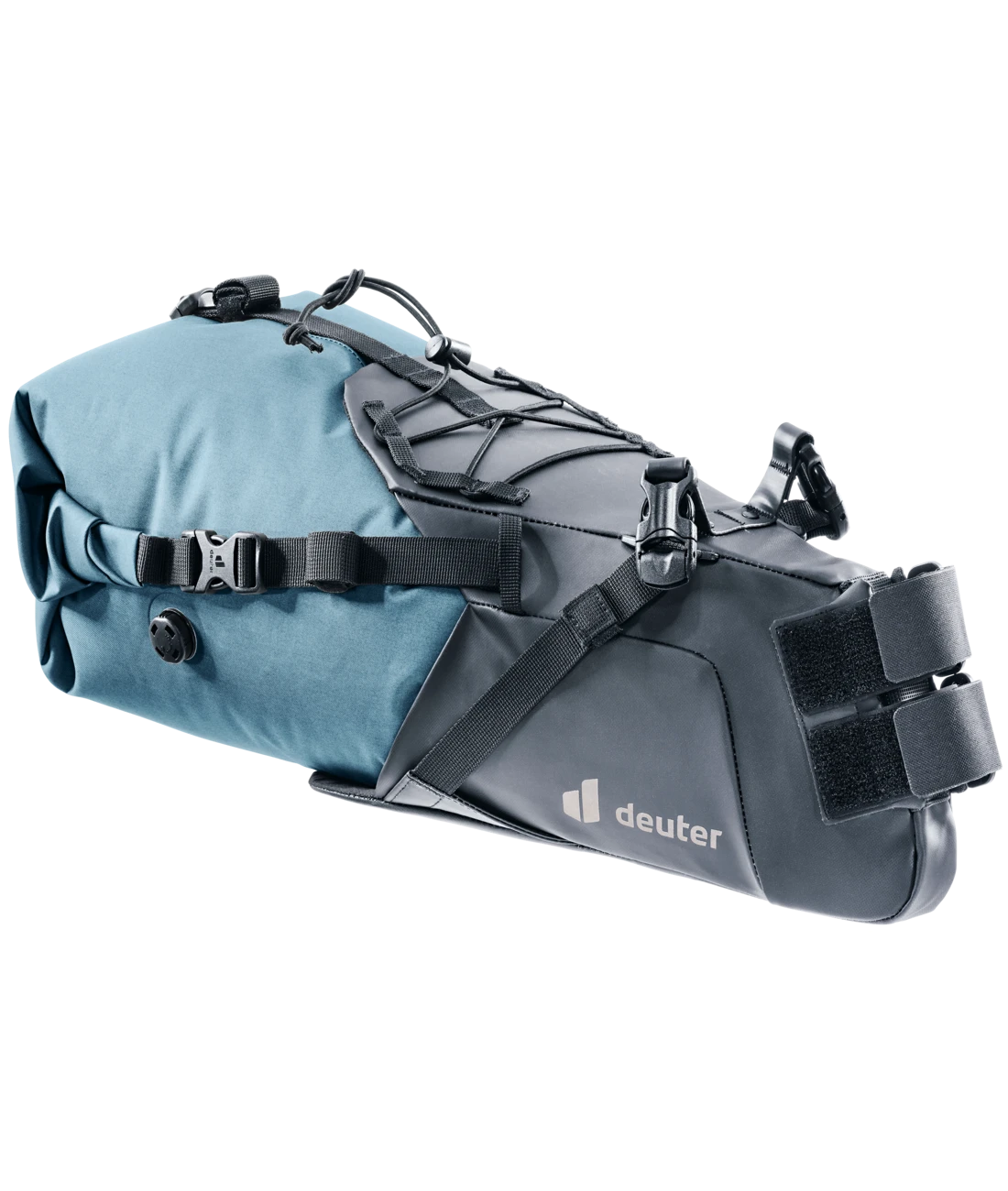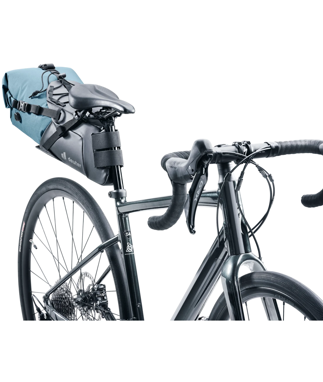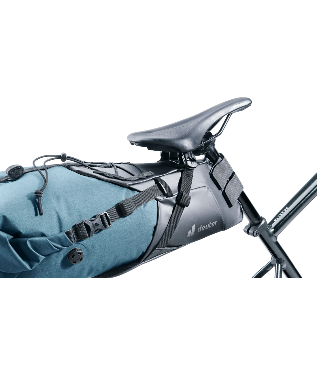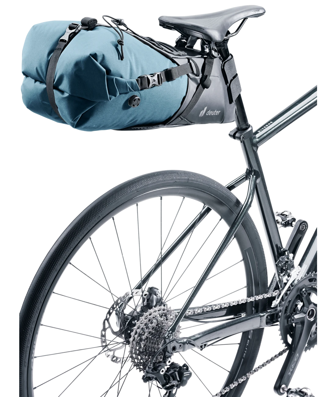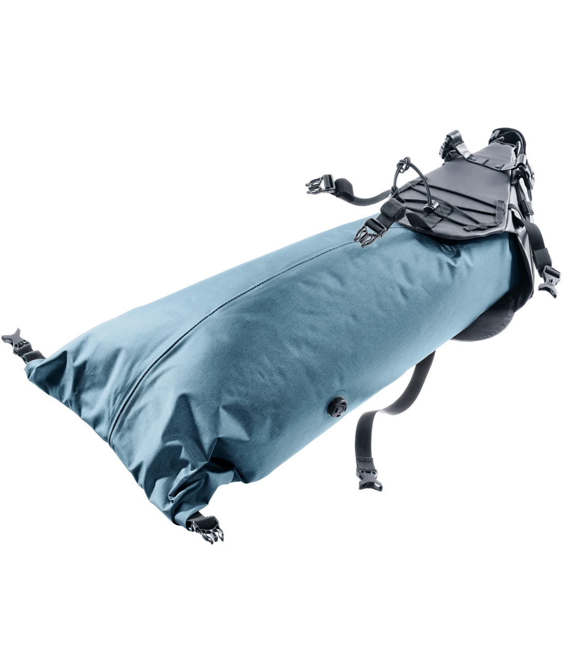 Leichte zweiteilige Satteltasche für echte Globetrotter aus leichtem, wasserdichtem Packsack mit beidseitigem Roll-Top und Komprimierungsventil sowie Lenkertasche aus strapazierfähigem Material mit elastischem Kompressionszug und Materialschlaufen auf der Oberseite, ermöglicht schnelles Be- und Entladen bei spontanen Zwischenstopps, da die Taschenhalterungen am Fahrrad belassen, während der Packsack mitgenommen werden kann. Die robusten Gurtbänder können dank Klettverschluss zur Verdrehsicherung und mitgelieferter Distanzstücke an unterschiedlichste Rohrdurchmesser angepasst werden und sind auch für Carbon-Fahrräder geeignet.