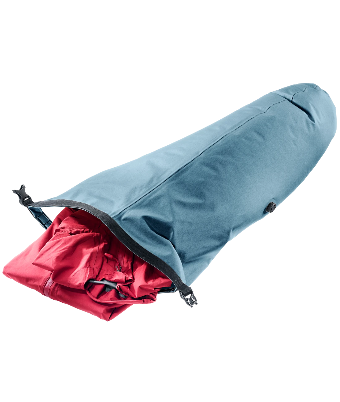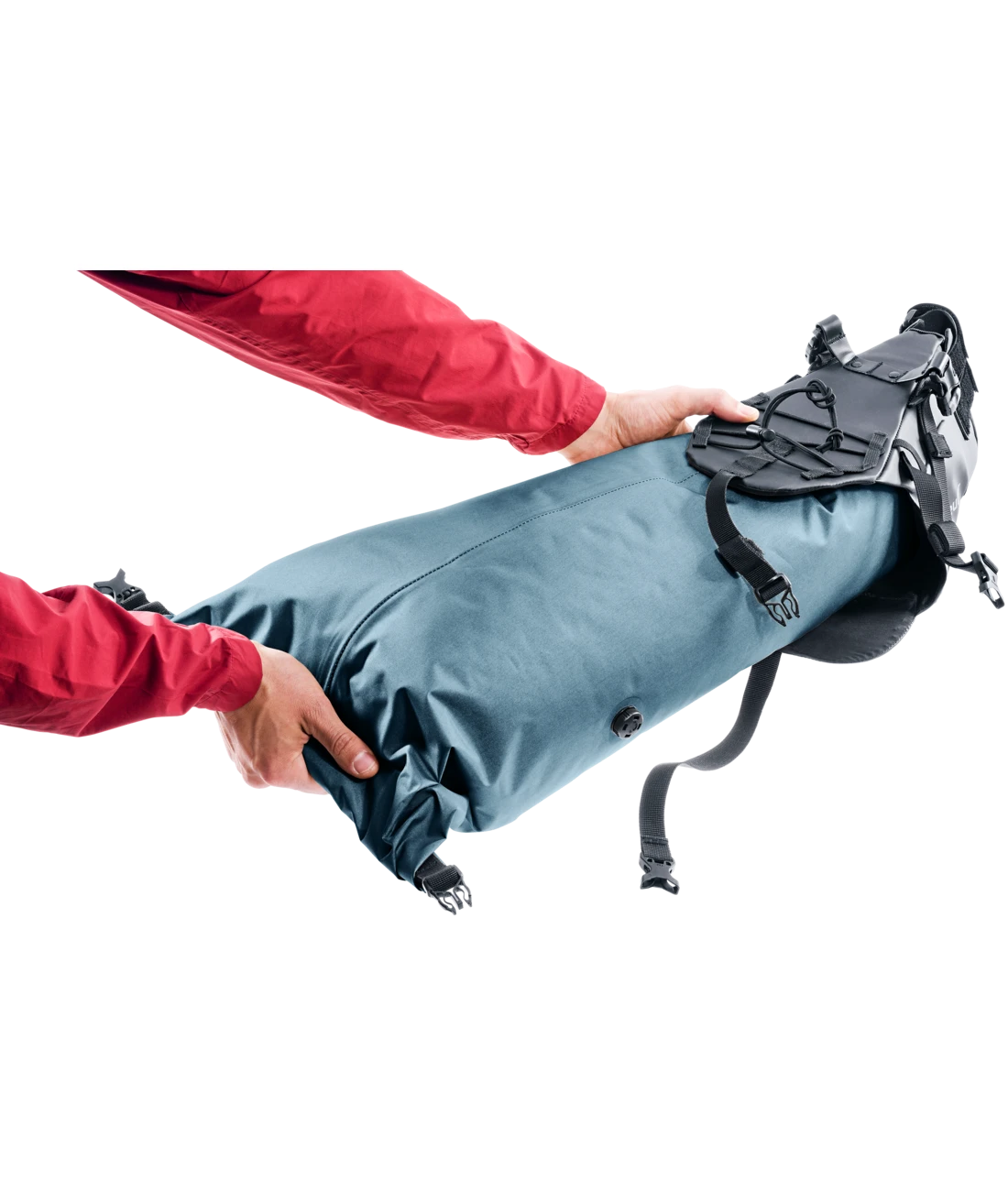 - Packsack mit Rolltop durch Gurtbänder mit Schnallen an Satteltasche seitlich und mittig fixierbar