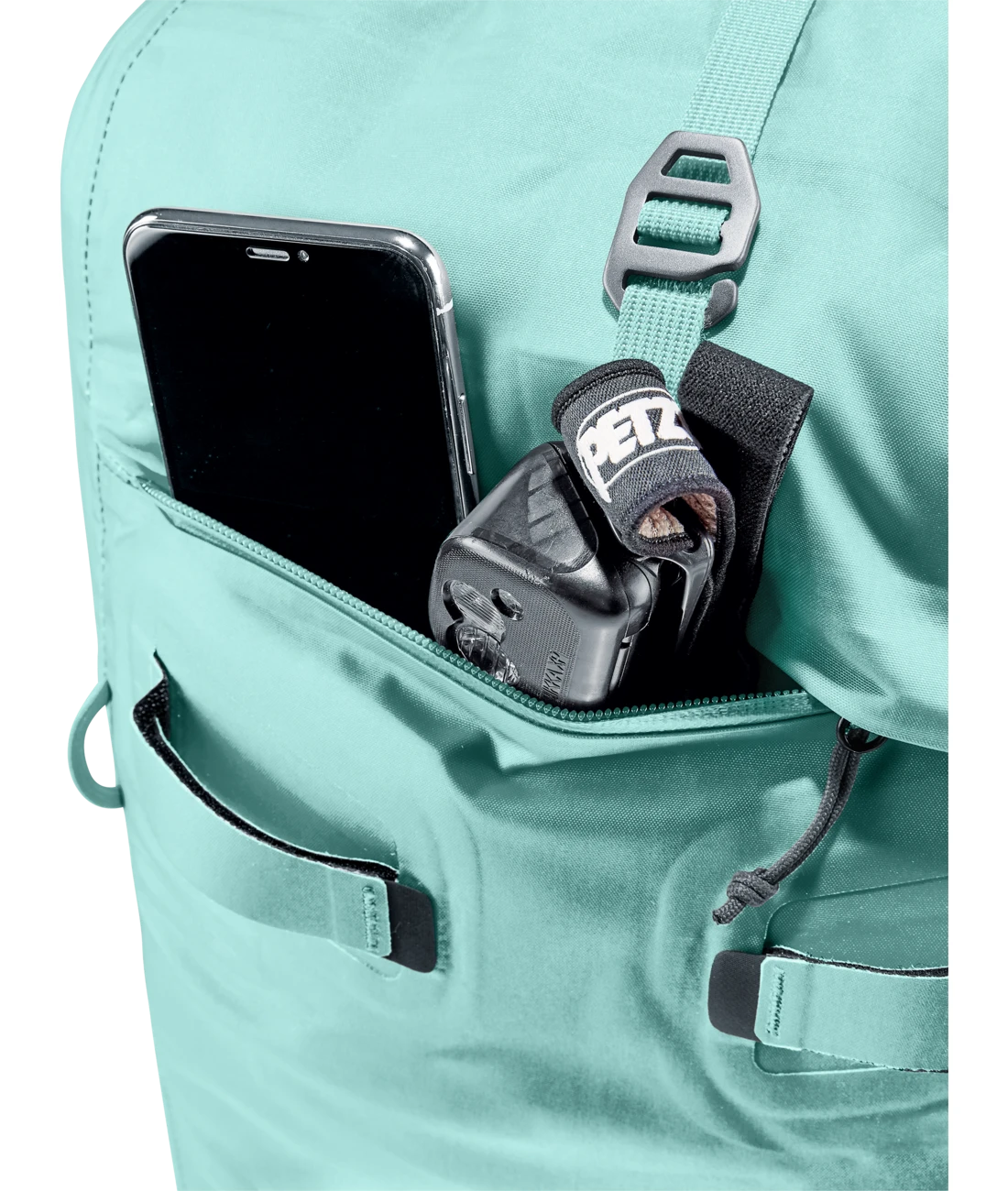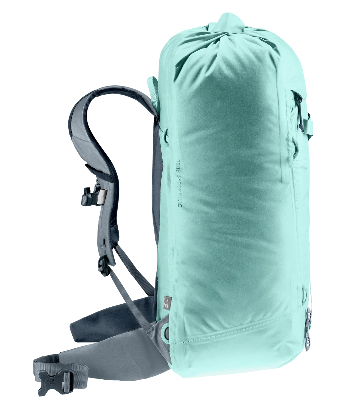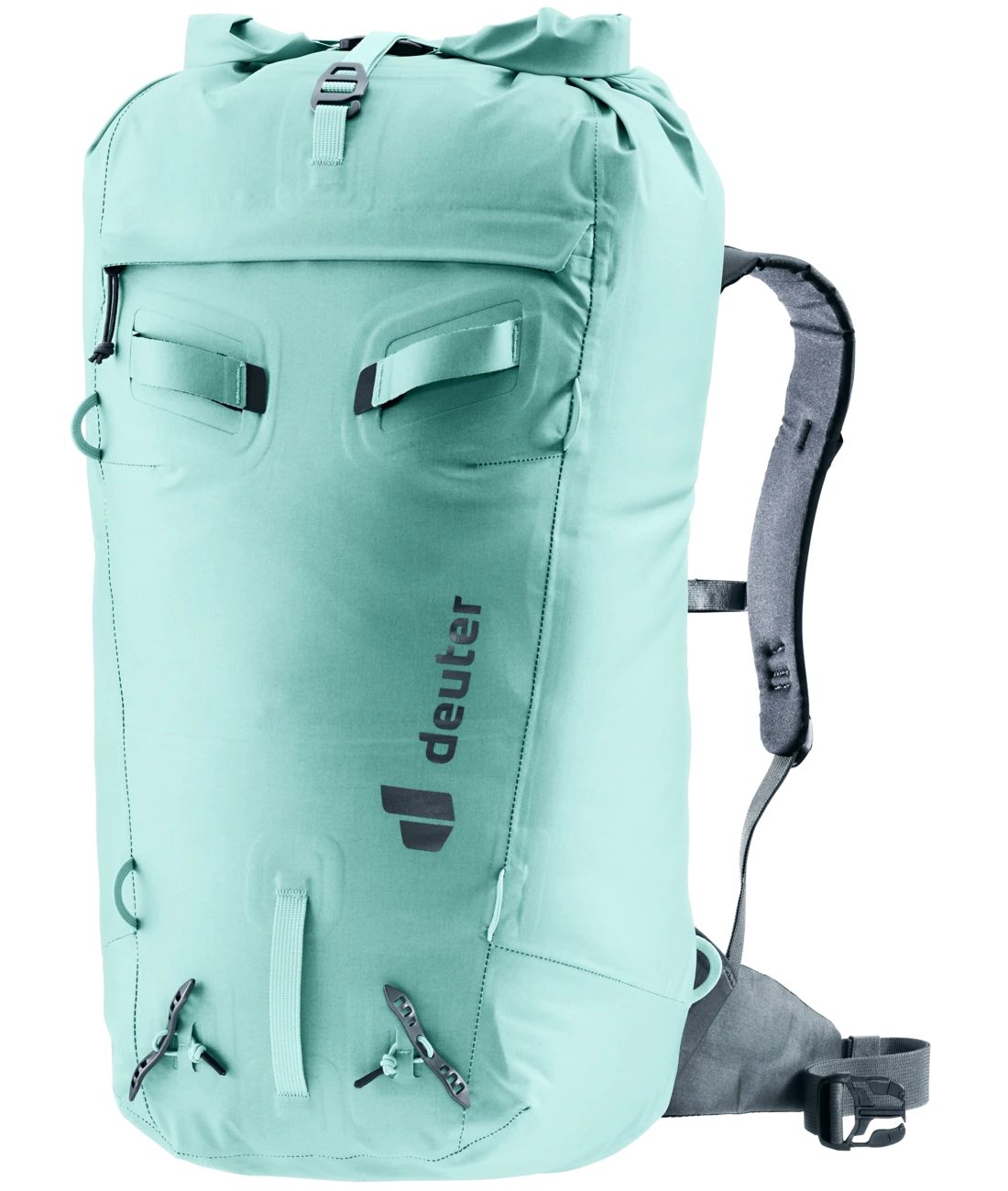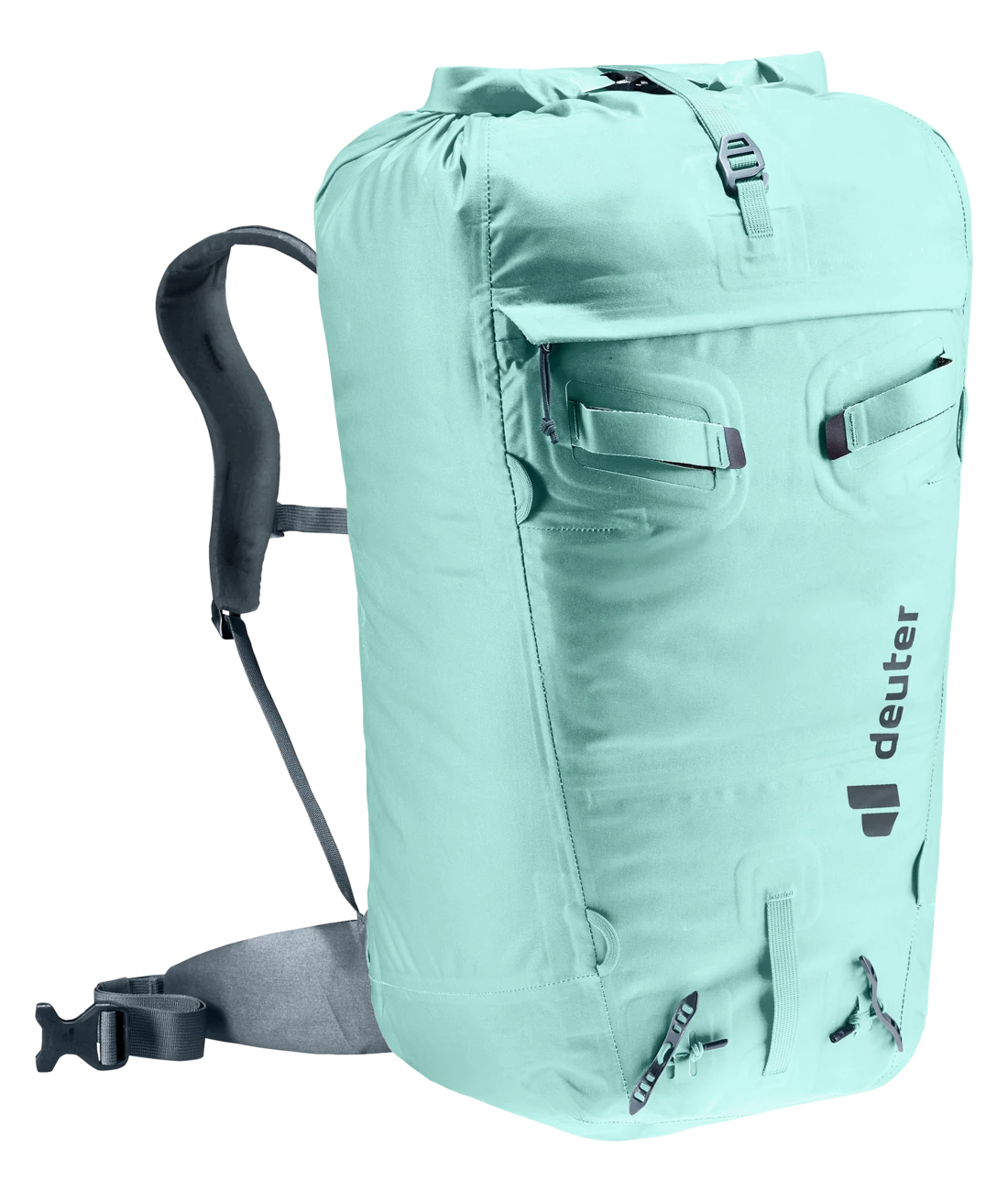 Strapazierfähiges Material, getapte, wasserdicht versiegelte Nähte, TPU beschichtete und mit einem Flap geschützte Reißverschlüsse sowie die Rolltop-Deckelkonstruktion schützen den Inhalt des Mountaineering-Rucksacks sicher vor dem Eindringen von Nässe. Zudem sorgen durchdachte Befestigungsschlaufen und seitlich verstaubare Hüftflossen nicht nur für ein herausragendes Komfort-Gewichts-Verhältnis, sondern ermöglichen Bergsportlerinnen auch das Tragen eines Gurtes und damit den vielseitigen Einsatz des wasserdichten Rucksacks.