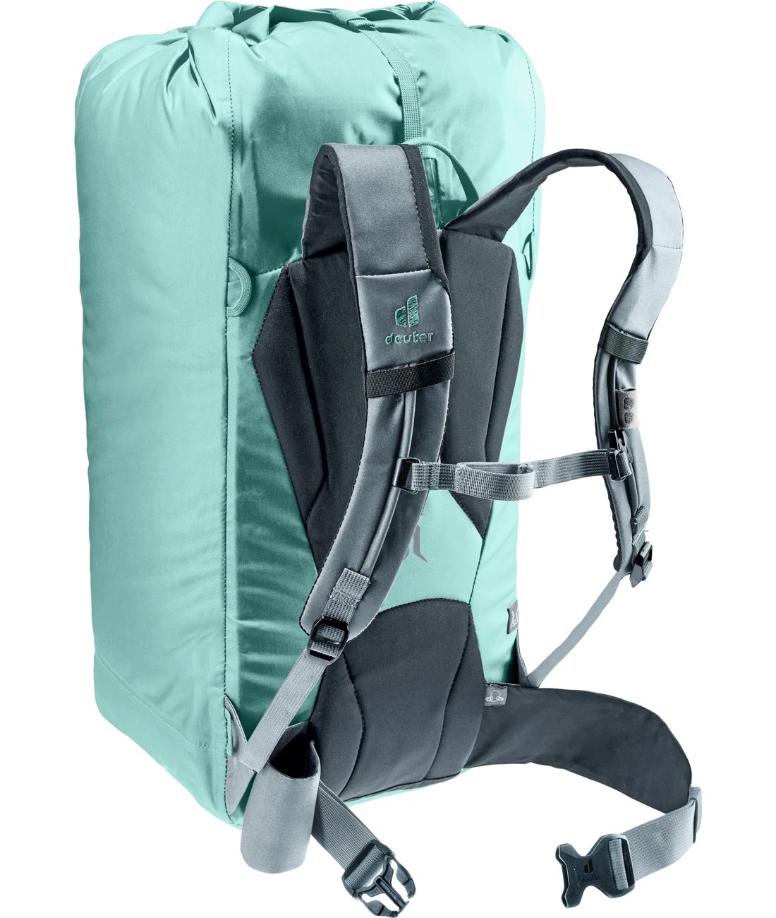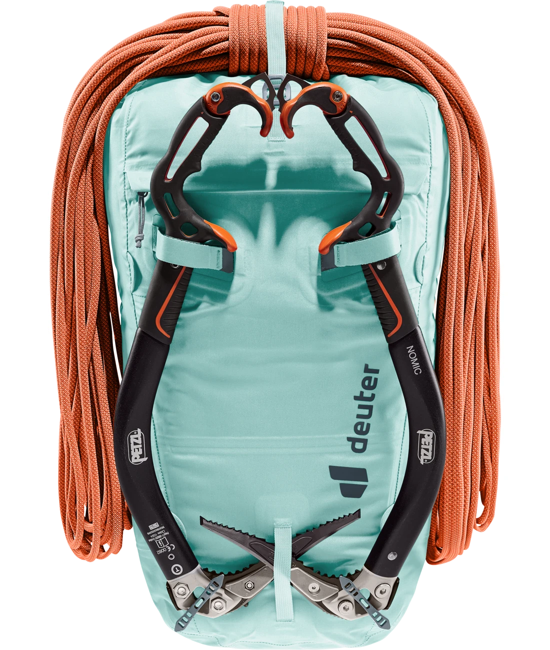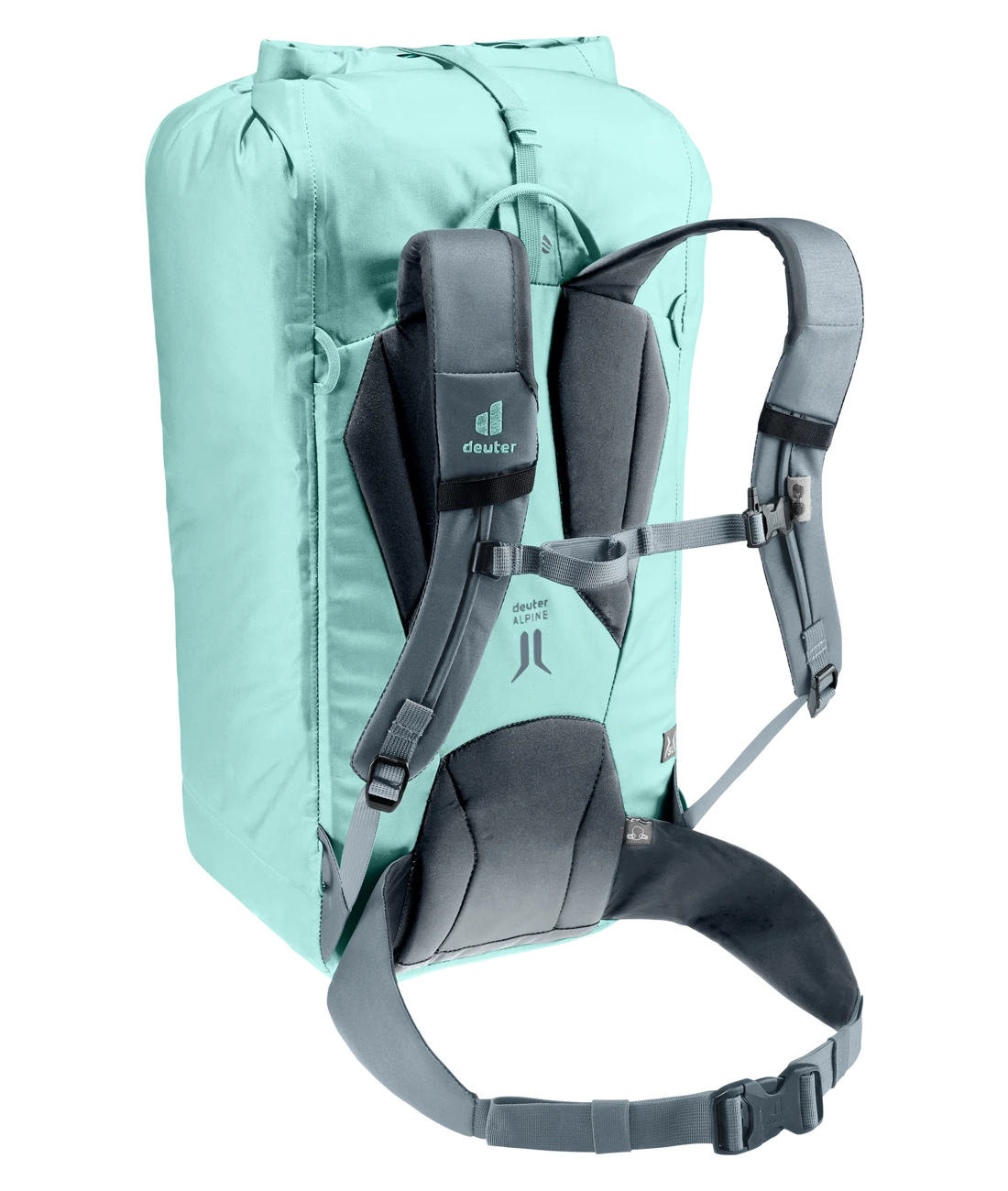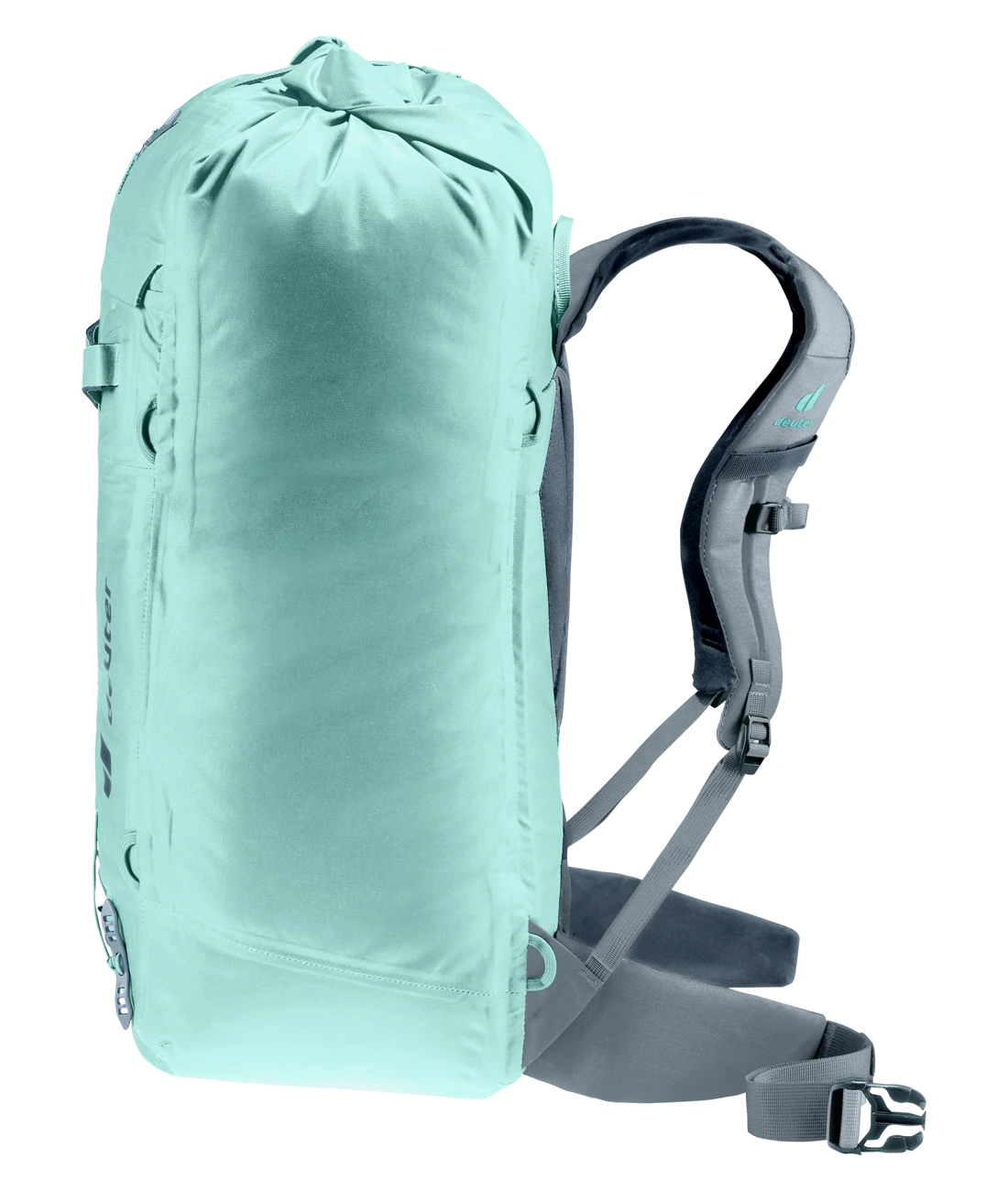 Strapazierfähiges Material, getapte, wasserdicht versiegelte Nähte, TPU beschichtete und mit einem Flap geschützte Reißverschlüsse sowie die Rolltop-Deckelkonstruktion schützen den Inhalt des Mountaineering-Rucksacks sicher vor dem Eindringen von Nässe. Zudem sorgen durchdachte Befestigungsschlaufen und seitlich verstaubare Hüftflossen nicht nur für ein herausragendes Komfort-Gewichts-Verhältnis, sondern ermöglichen Bergsportlerinnen auch das Tragen eines Gurtes und damit den vielseitigen Einsatz des wasserdichten Rucksacks.