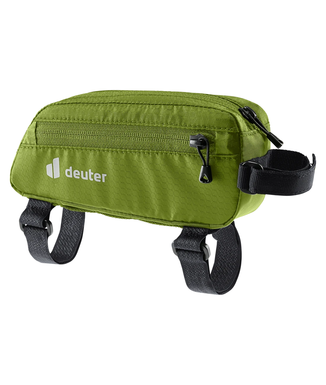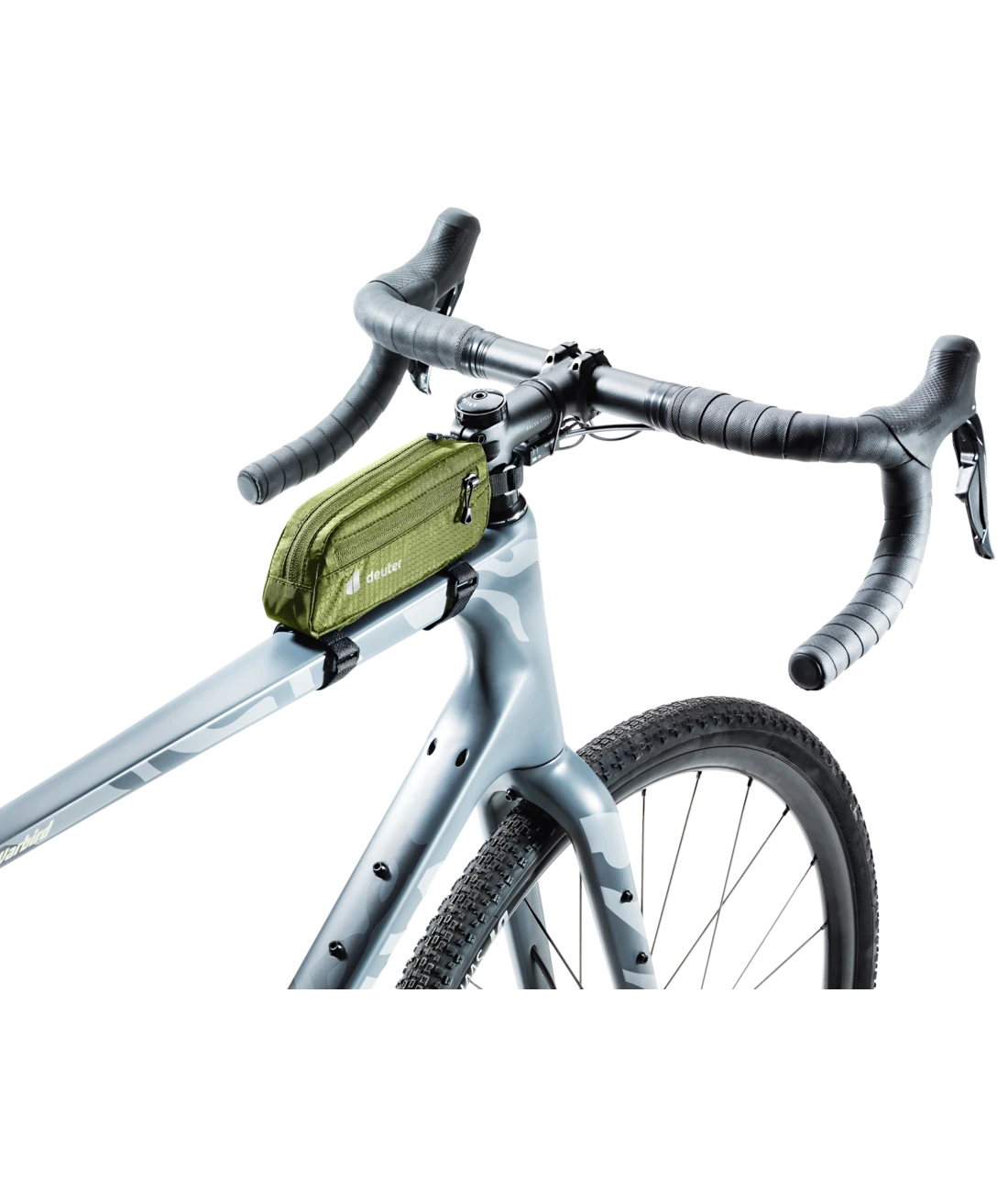 Praktische Reißverschlusstasche, die einfach mit Klettverschluss am Fahrradrahmen befestigt wird und Energieriegel, Geld, Smartphone oder Schlüssel immer griffbereit hält.