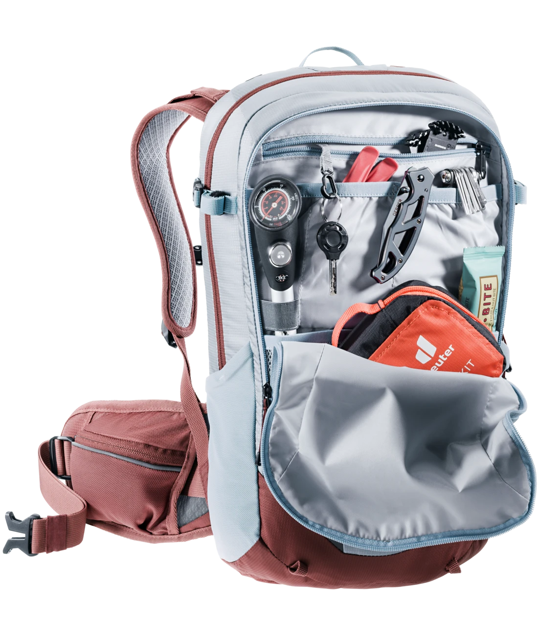 - Vortasche mit großem Organisationsteil und RV-Netztasche für Schlauch, Werkzeug und Pumpenhalterung