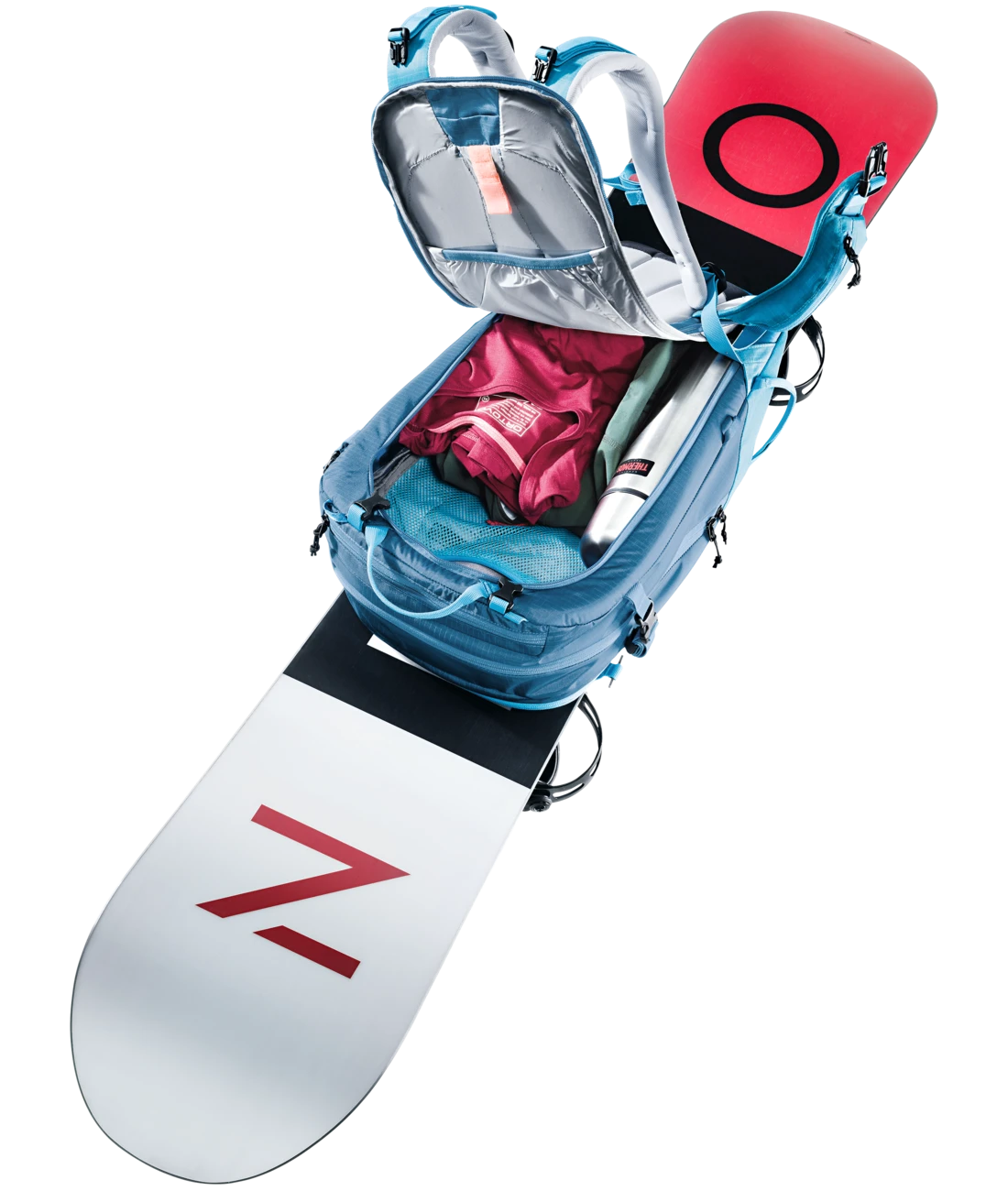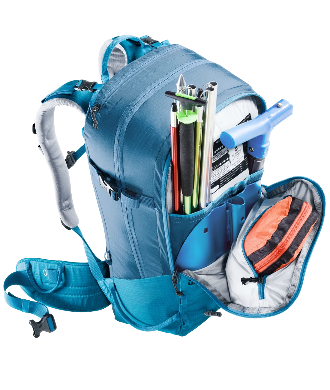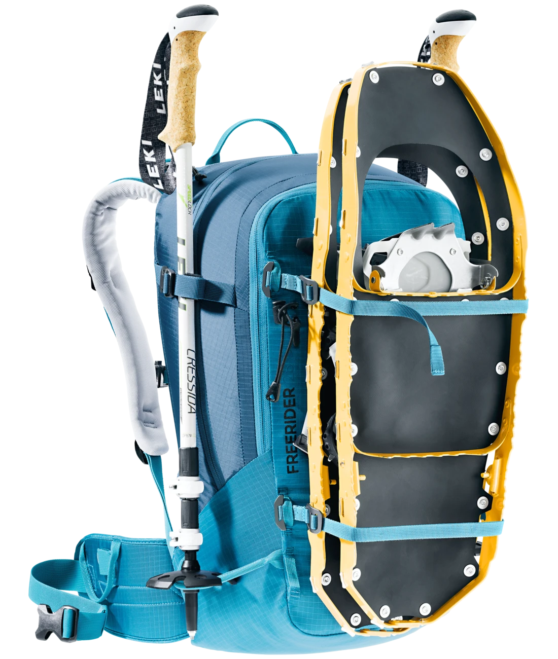 - Zwei separate, verstaubare Befestigungsriemen um Ski (diagonal oder A-Frame), Snowboard oder Schneeschuhe zu fixieren oder den Rucksack zu komprimieren + seitliche Skihalterung