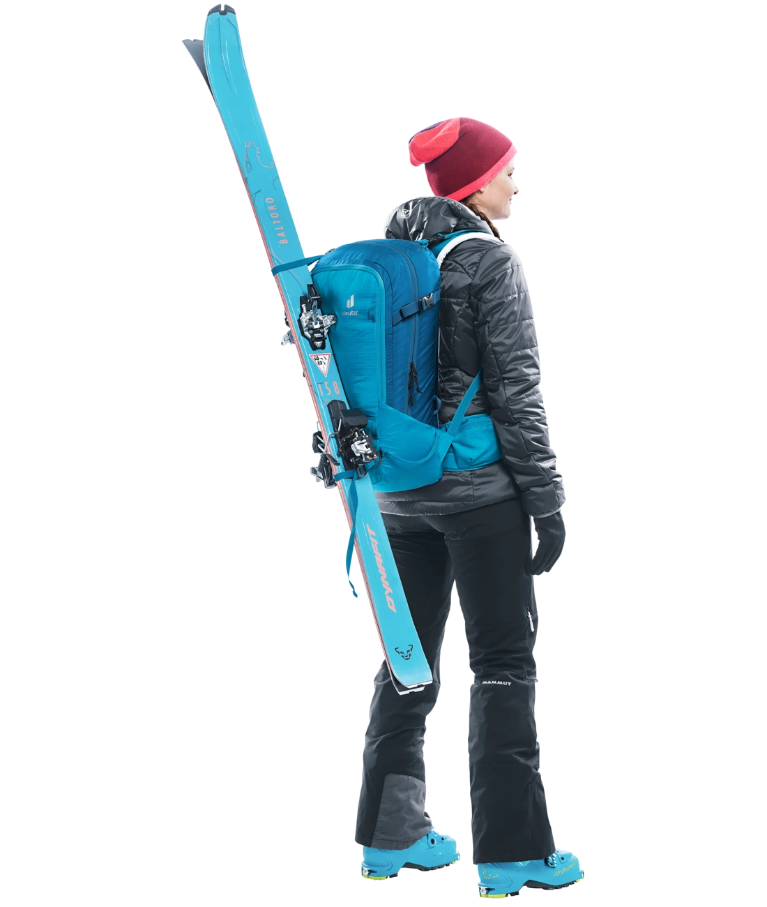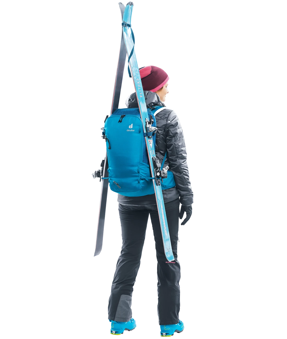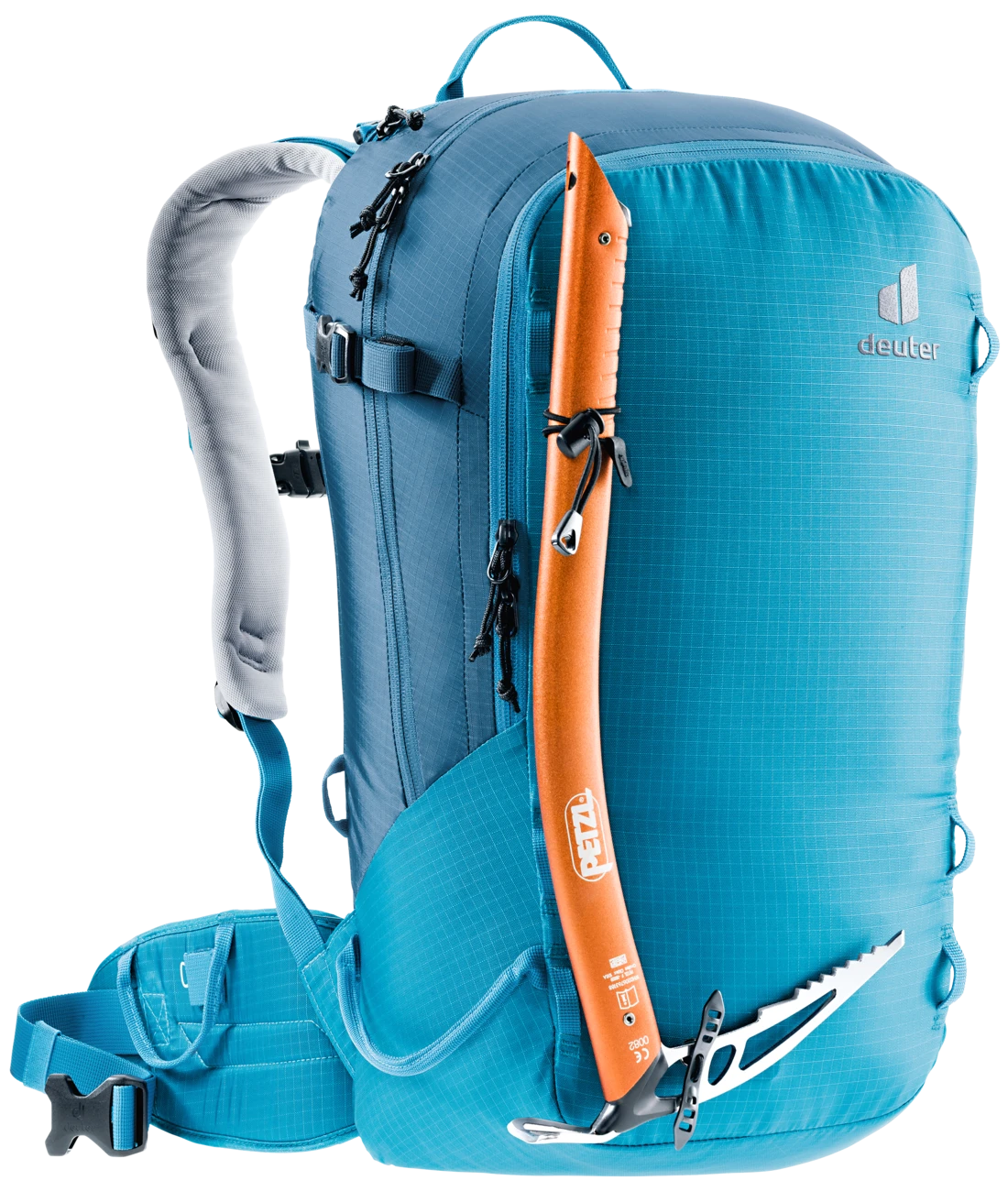 - Zwei separate, verstaubare Befestigungsriemen um Ski (diagonal oder A-Frame), Snowboard oder Schneeschuhe zu fixieren oder den Rucksack zu komprimieren + seitliche Skihalterung