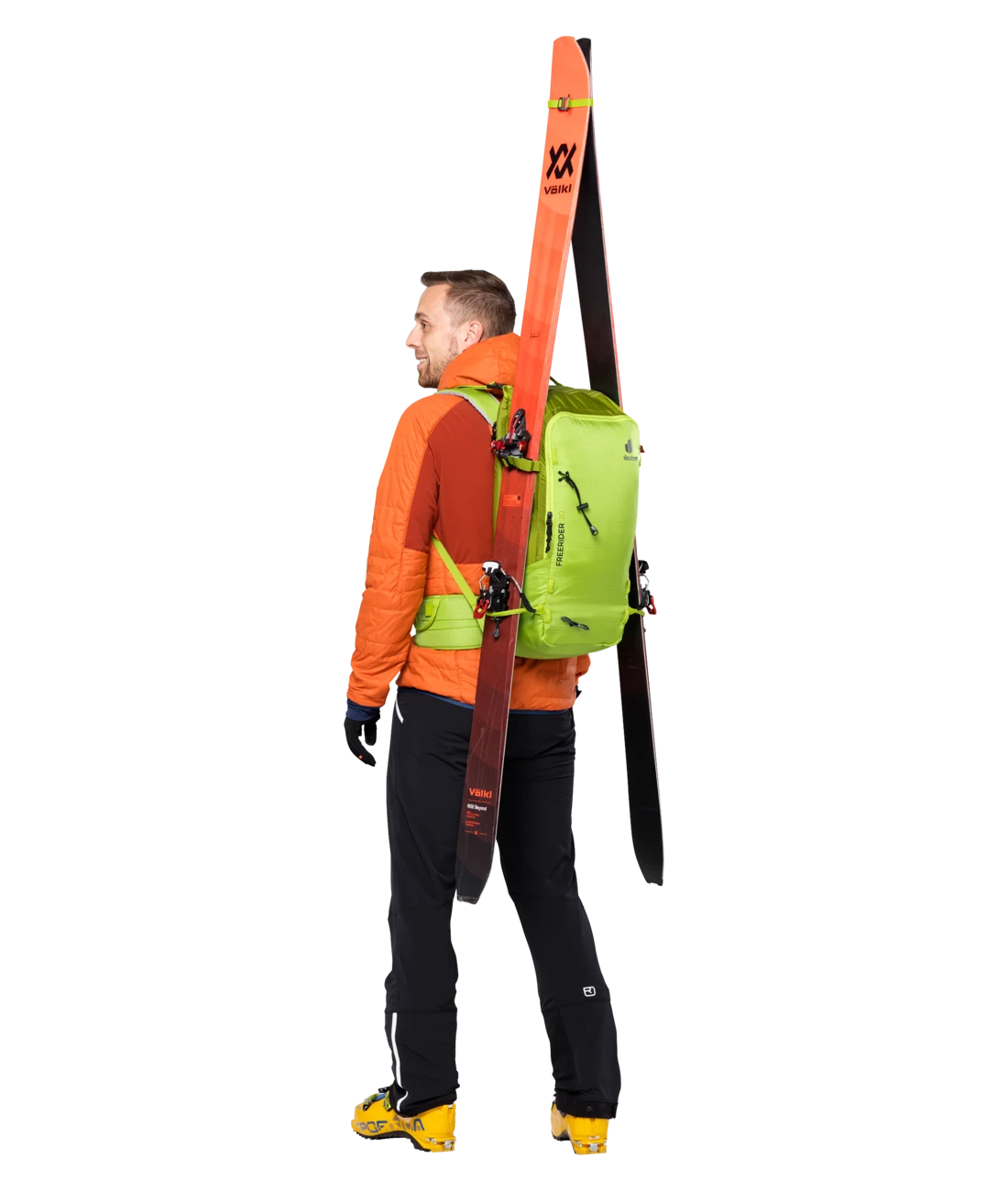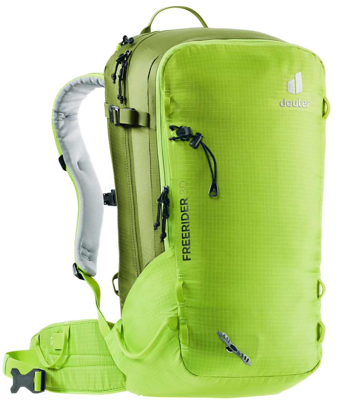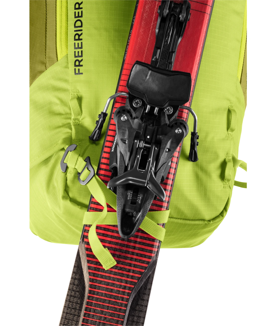Der Freerider besticht mit seiner durchdachten Winter-Ausstattung, zum Beispiel mit der komplett aufklappbaren Rückenöffnung. Zum einen bietet er so einen optimalen Überblick über die Ausrüstung. Zum anderen bleibt das Rückensystem beim Ablegen des Rucksacks trocken. Sollte trotzdem etwas Schnee an das Tragesystem gelangen, sorgt das neue robuste, atmungsaktive und schneeabweisende Material für einen trockenen Rücken. Auch das Thema Sicherheit wird beim Freerider großgeschrieben. Mit dem separaten und schnell zugänglichen Sicherheitsfach für Sonde und Schaufel hält der Touren-Rucksack das Wichtigste im Notfall griffbereit. Neu ist auch das variable Fixierungssystem. Mit zwei separaten Riemen können Skier, Snowboard und Schneeschuhe im Handumdrehen außen am Rucksack befestigt werden: Skier diagonal oder in A-Form, Snowboard und Schneeschuhe vertikal. Außerdem dienen die flexibel einsetzbaren Befestigungsriemen zur seitlichen Kompression.