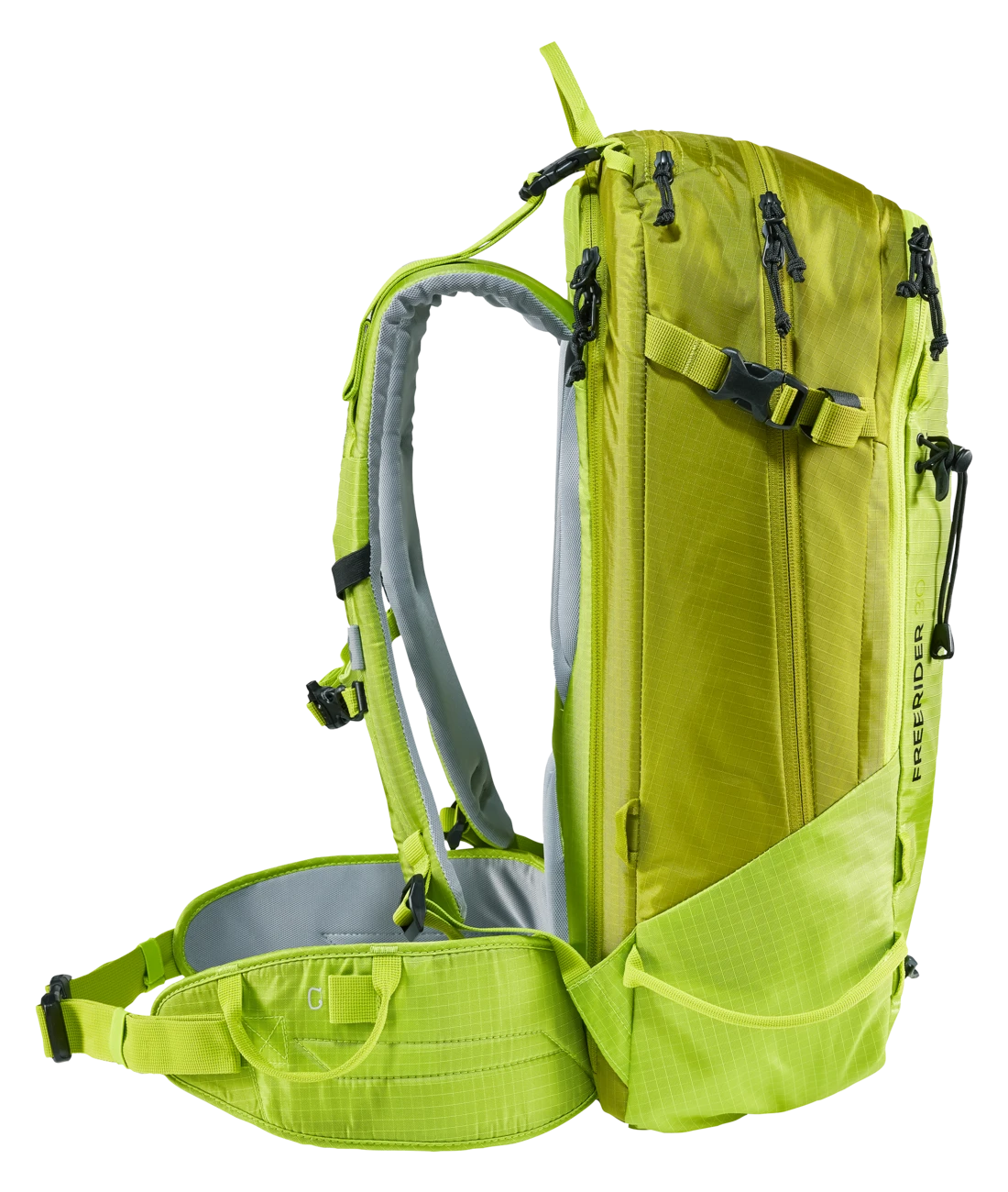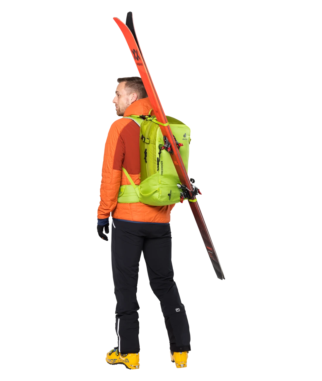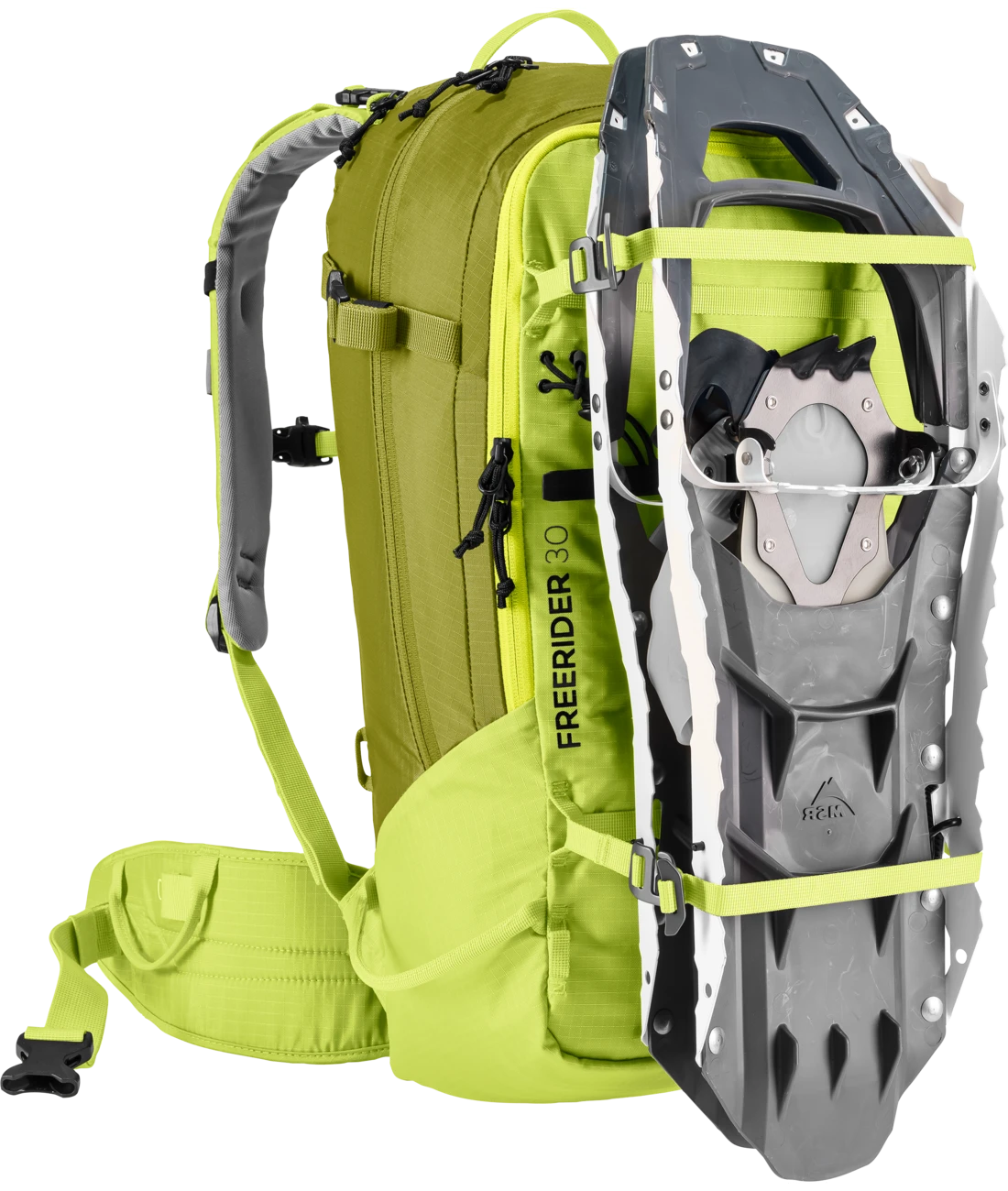 Der Freerider besticht mit seiner durchdachten Winter-Ausstattung, zum Beispiel mit der komplett aufklappbaren Rückenöffnung. Zum einen bietet er so einen optimalen Überblick über die Ausrüstung. Zum anderen bleibt das Rückensystem beim Ablegen des Rucksacks trocken. Sollte trotzdem etwas Schnee an das Tragesystem gelangen, sorgt das neue robuste, atmungsaktive und schneeabweisende Material für einen trockenen Rücken. Auch das Thema Sicherheit wird beim Freerider großgeschrieben. Mit dem separaten und schnell zugänglichen Sicherheitsfach für Sonde und Schaufel hält der Touren-Rucksack das Wichtigste im Notfall griffbereit. Neu ist auch das variable Fixierungssystem. Mit zwei separaten Riemen können Skier, Snowboard und Schneeschuhe im Handumdrehen außen am Rucksack befestigt werden: Skier diagonal oder in A-Form, Snowboard und Schneeschuhe vertikal. Außerdem dienen die flexibel einsetzbaren Befestigungsriemen zur seitlichen Kompression.