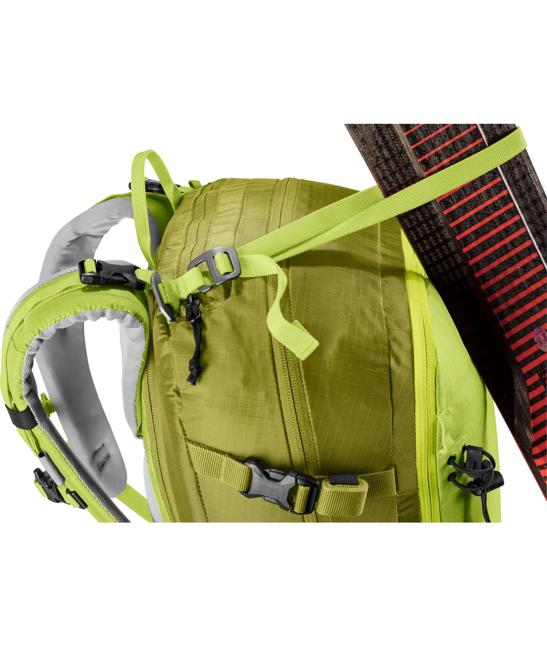 - Zwei separate, verstaubare Befestigungsriemen um Ski (diagonal oder A-Frame), Snowboard oder Schneeschuhe zu fixieren oder den Rucksack zu komprimieren + seitliche Skihalterung