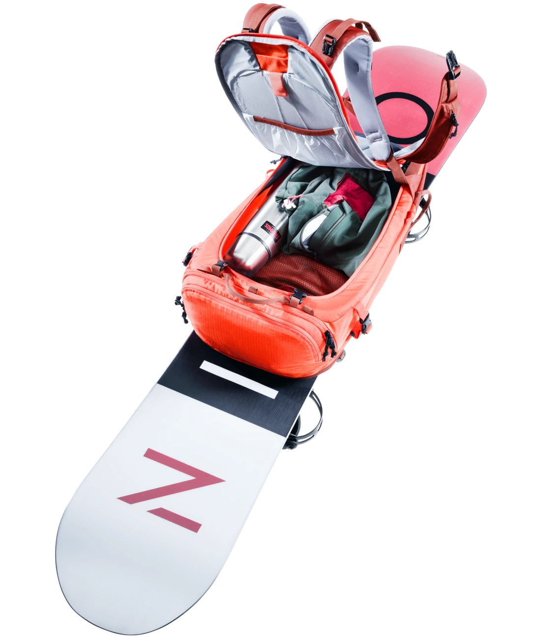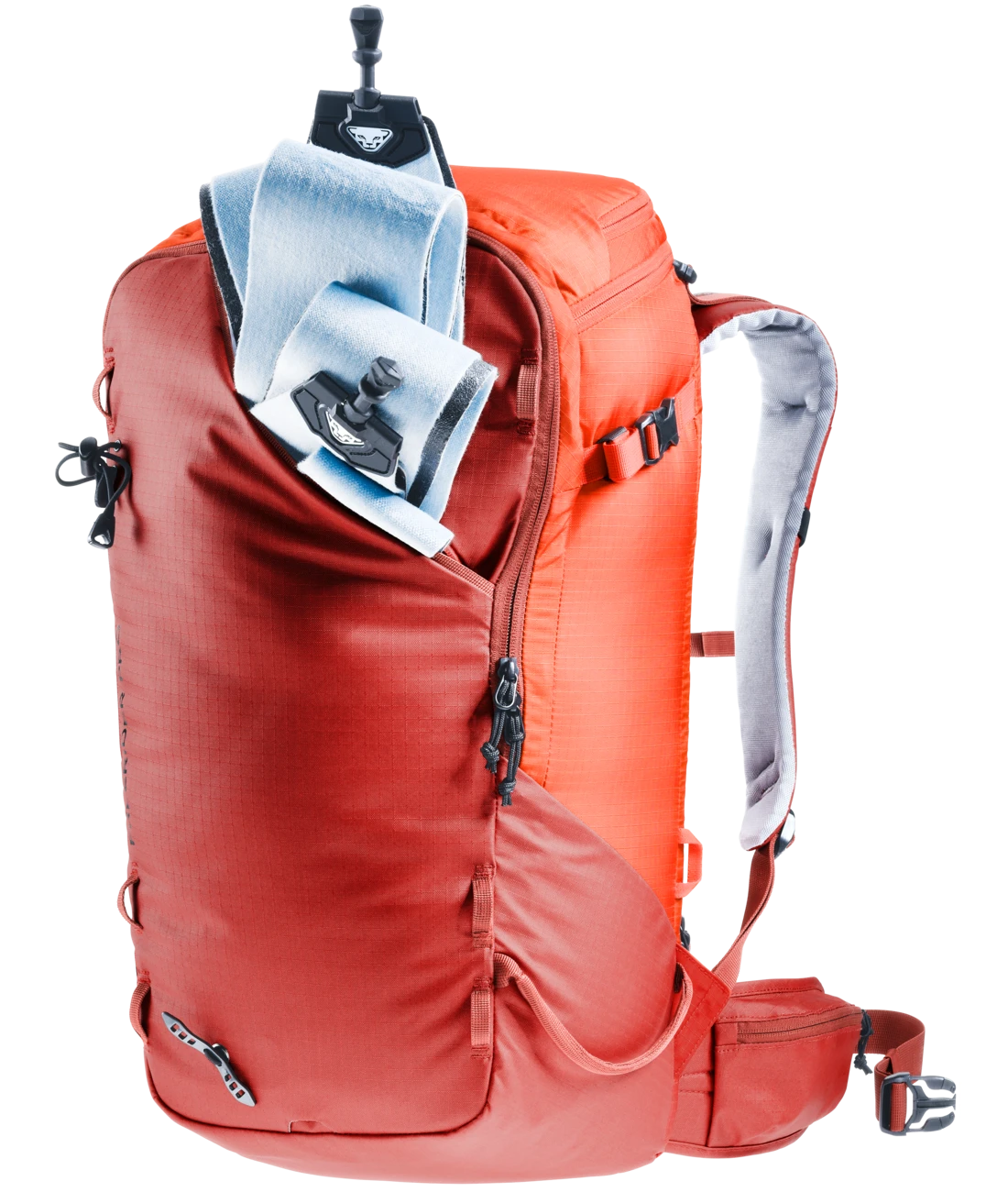 - Zwei separate, verstaubare Befestigungsriemen um Ski (diagonal oder A-Frame), Snowboard oder Schneeschuhe zu fixieren oder den Rucksack zu komprimieren + seitliche Skihalterung