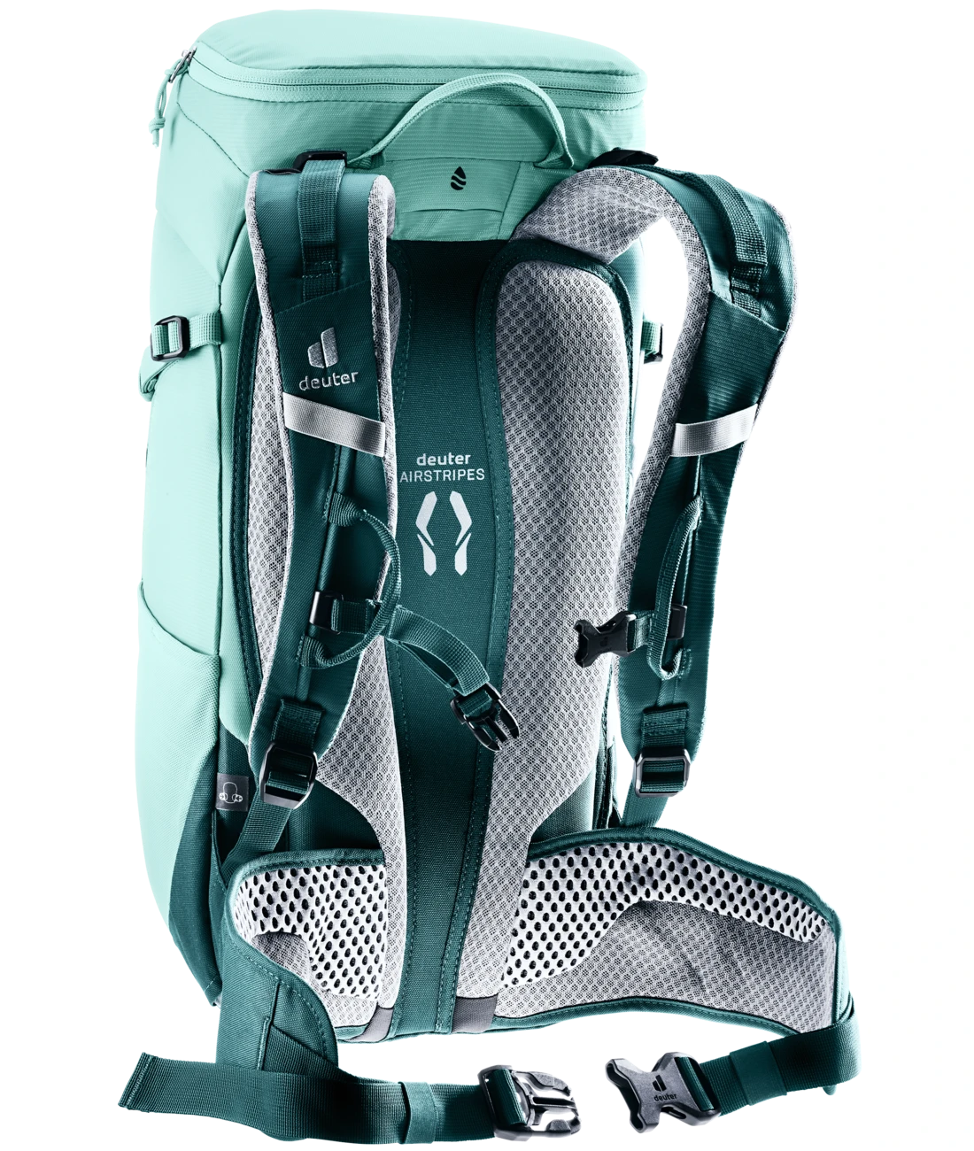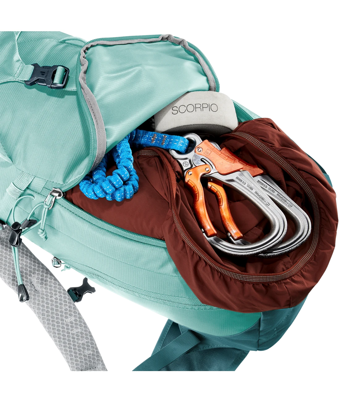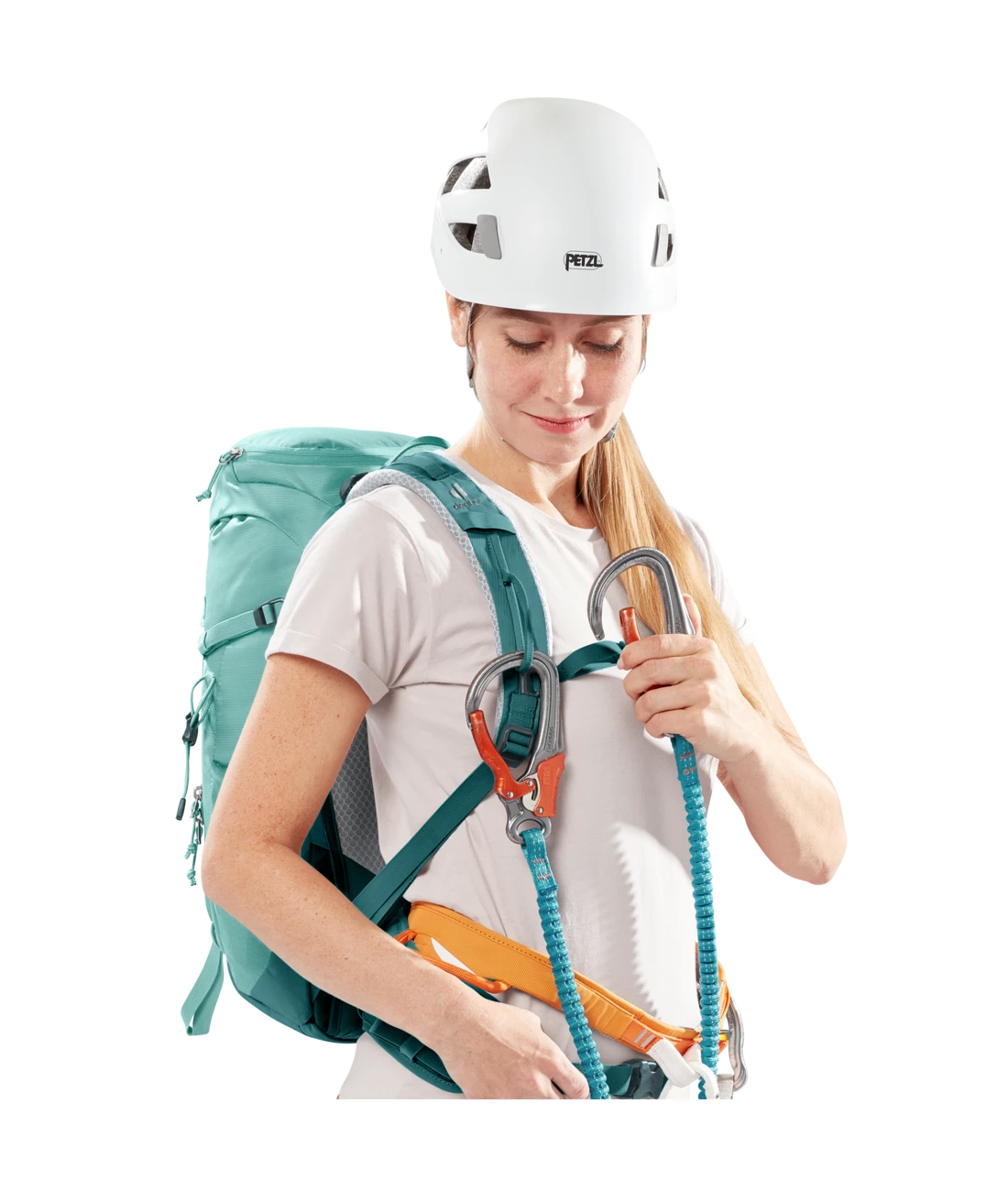 Das Airstripes Rückensystem mit geringer Rückenauflage und großen Belüftungskanälen sowie die perforierten Schulterträger und Hüftflossen sorgen für optimale Luftzirkulation, eine körpernahe Gewichtsverteilung und damit einen kompakten Sitz in jedem Terrain. Die flache Deckelkonstruktion bietet gute Kopffreiheit – auch mit Helm. Dank Fixierungen an den Schulterträgern sind die Karabiner des Klettersteigsets stets griffbereit. Zudem sind Ausrüstungsgegenstände und Material dank großem Reißverschluss-Frontzugang und Seitentaschen schnell zur Hand.