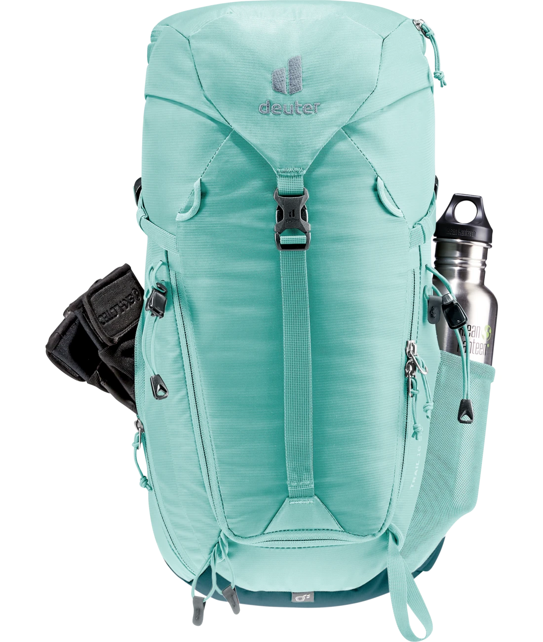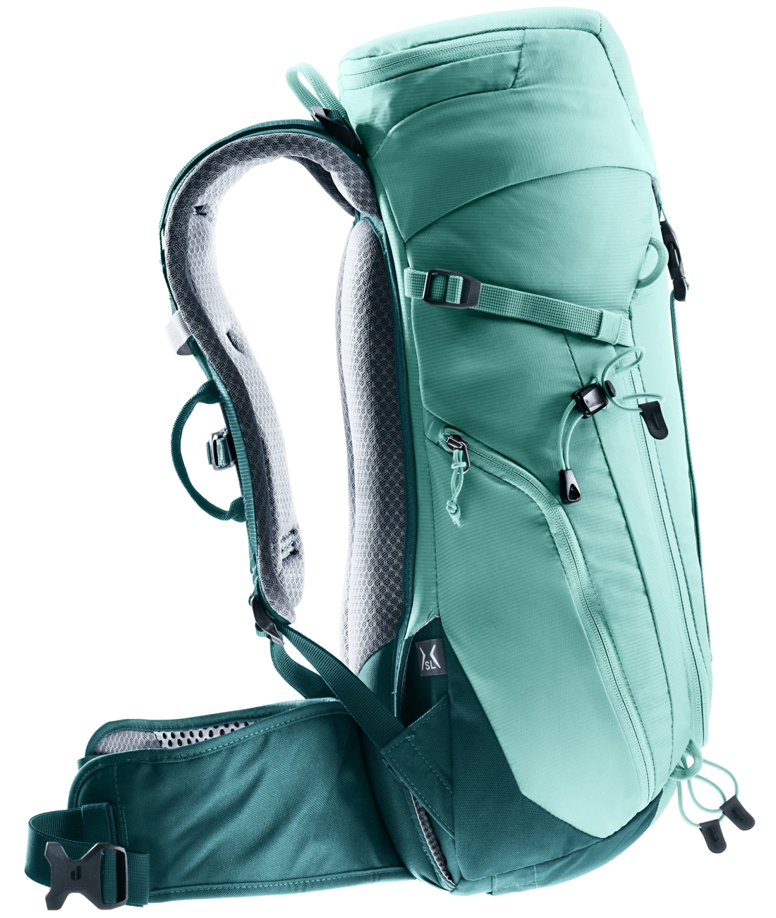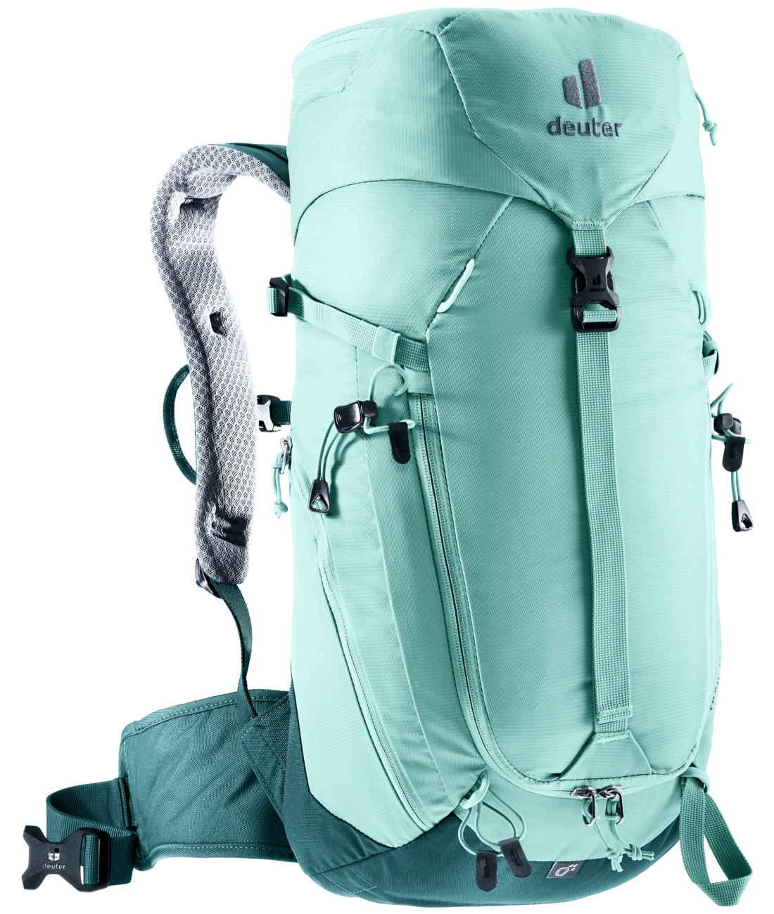 Das Airstripes Rückensystem mit geringer Rückenauflage und großen Belüftungskanälen sowie die perforierten Schulterträger und Hüftflossen sorgen für optimale Luftzirkulation, eine körpernahe Gewichtsverteilung und damit einen kompakten Sitz in jedem Terrain. Die flache Deckelkonstruktion bietet gute Kopffreiheit – auch mit Helm. Dank Fixierungen an den Schulterträgern sind die Karabiner des Klettersteigsets stets griffbereit. Zudem sind Ausrüstungsgegenstände und Material dank großem Reißverschluss-Frontzugang und Seitentaschen schnell zur Hand.