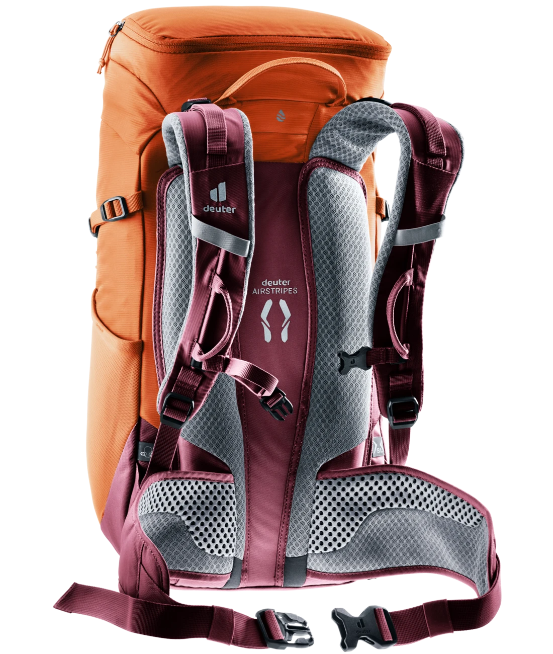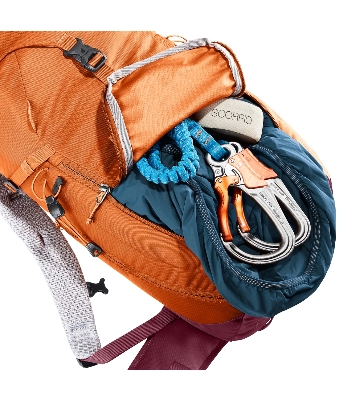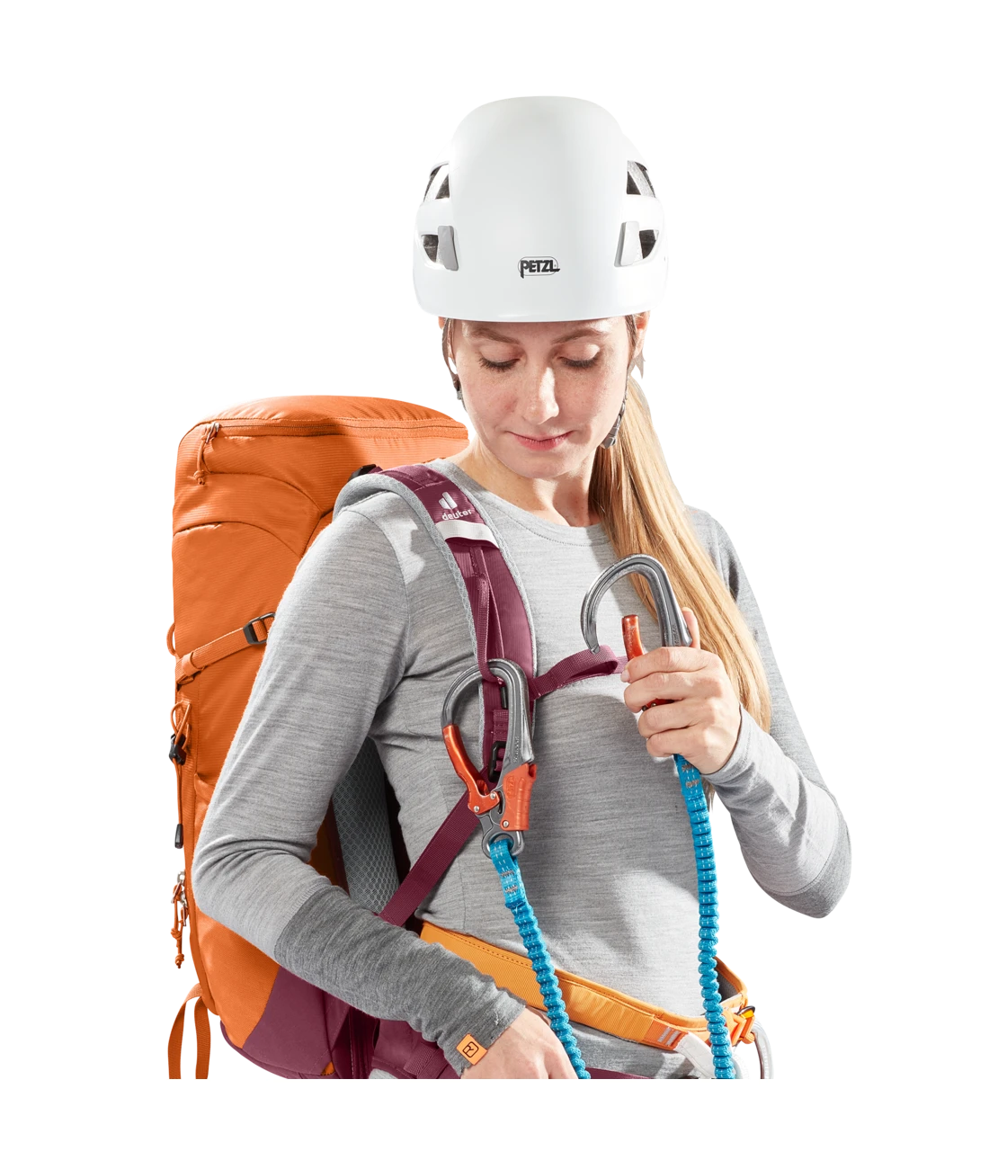 Das Airstripes Rückensystem mit geringer Rückenauflage und großen Belüftungskanälen sowie die perforierten Schulterträger und Hüftflossen sorgen für optimale Luftzirkulation, eine körpernahe Gewichtsverteilung und damit einen kompakten Sitz in jedem Terrain. Die flache Deckelkonstruktion bietet gute Kopffreiheit – auch mit Helm. Dank Fixierungen an den Schulterträgern sind die Karabiner des Klettersteigsets stets griffbereit. Zudem sind Ausrüstungsgegenstände und Material dank großem Reißverschluss-Frontzugang und Seitentaschen schnell zur Hand.
