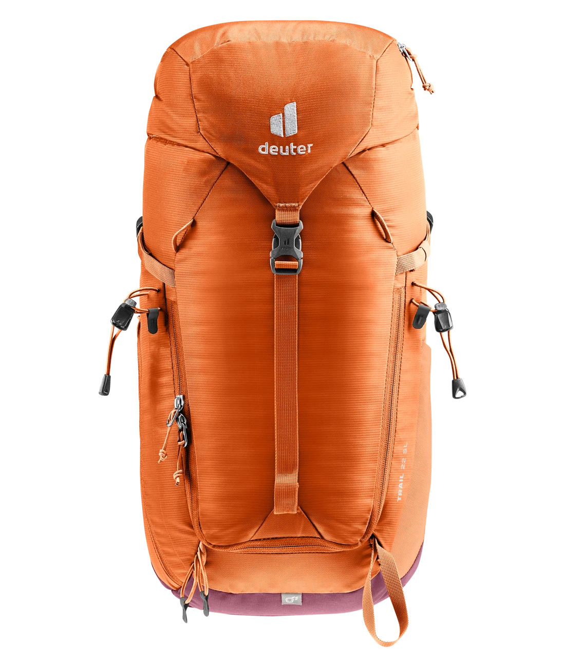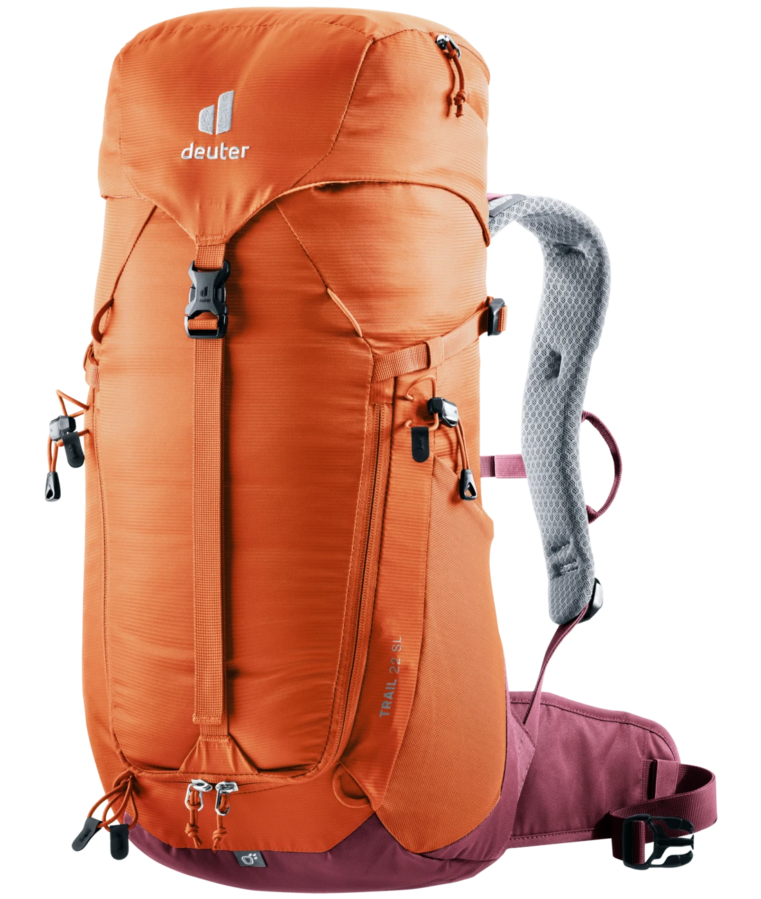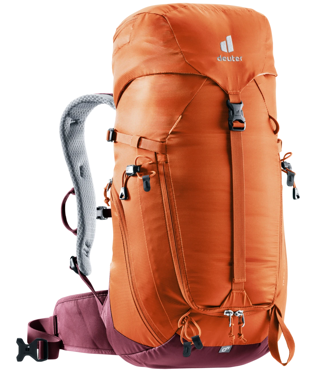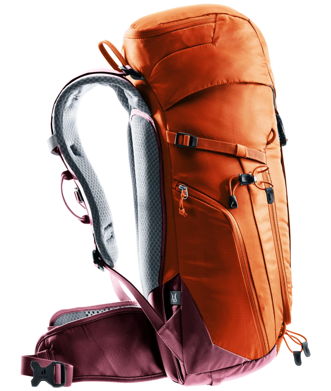Das Airstripes Rückensystem mit geringer Rückenauflage und großen Belüftungskanälen sowie die perforierten Schulterträger und Hüftflossen sorgen für optimale Luftzirkulation, eine körpernahe Gewichtsverteilung und damit einen kompakten Sitz in jedem Terrain. Die flache Deckelkonstruktion bietet gute Kopffreiheit – auch mit Helm. Dank Fixierungen an den Schulterträgern sind die Karabiner des Klettersteigsets stets griffbereit. Zudem sind Ausrüstungsgegenstände und Material dank großem Reißverschluss-Frontzugang und Seitentaschen schnell zur Hand.